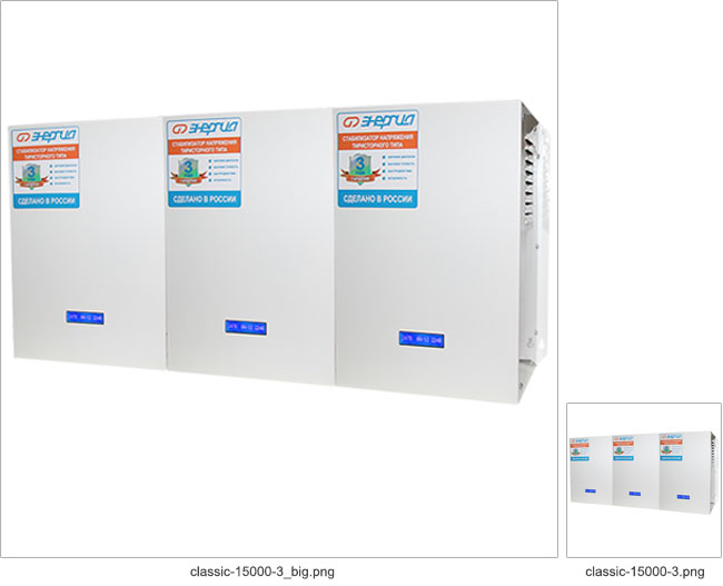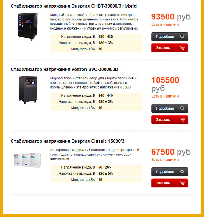 Возьмём, к примеру, запрос "Электронный трёхфазный стабилизатор на 15кВт". Как известно, электронных трёхфазных стабилизаторов не бывает. Для работы в трёхфазной сети, в блок объединяются 3 однофазных стабилизатора, обеспечивая независимую стабилизацию фазного напряжения 220В на каждой фазе.
