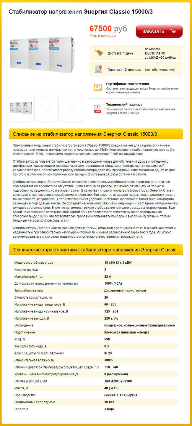 При подготовки описания следует сделать особый акцент на то, что данный товар является комплектом, т.е. представляет из себя несколько товаров. Это не только поможет покупателю более точно понять содржимое заказа, но и облегчит общение покупателя с менеджером магазина. Например, для нашего комплекта Classic-15000/3 уместно будет упомянуть, что это модульный стабилизатор состоящий из 3-х однофазных стабилизаторов.