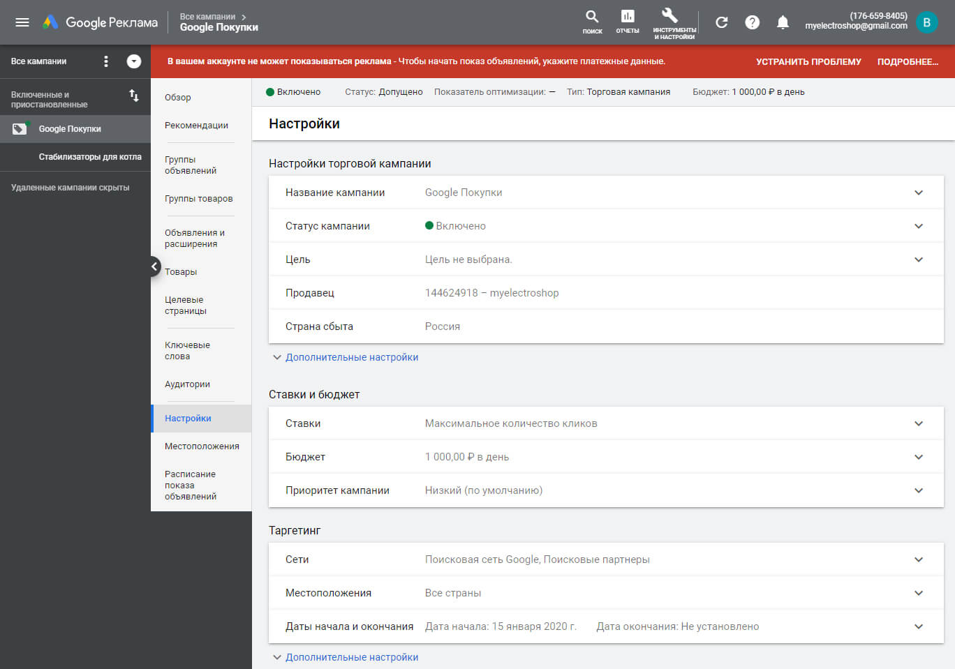 На этом настройку аккаунта Goggle Рекламы можно считать законченной и переходить к настройке рекламной компании. На главном экране выбираем нашу компанию, а в блоке управления пункт "Настройки":