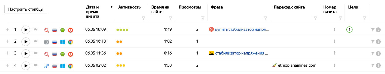 Звонок был совершен 06.05.24 в 18:12 и, логично предположить, что незадолго до этого, посетитель был на сайте и его посещение было зарегистрировано Я.Метрикой. Идем в вебвизор метрики и пробуем найти этого посетителя.