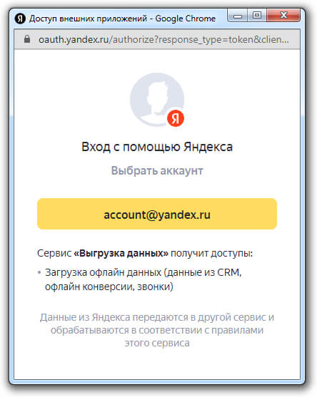 выбора аккаунта яндекса для которого необходимо выдать разрешение на загрузку оффлайн данных: