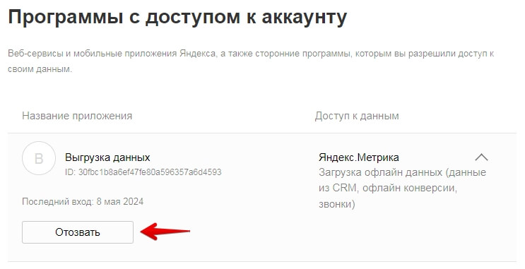 Нажатие которой вызывает открытие страницы управления аккунтам яндекса, где доступ к загрузке оффлайн данных может быть отозван.