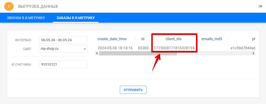 И, вот, теперь, после дополнения, когда у каждого звонка появился ClientID, можно отправлять данные в метрику.