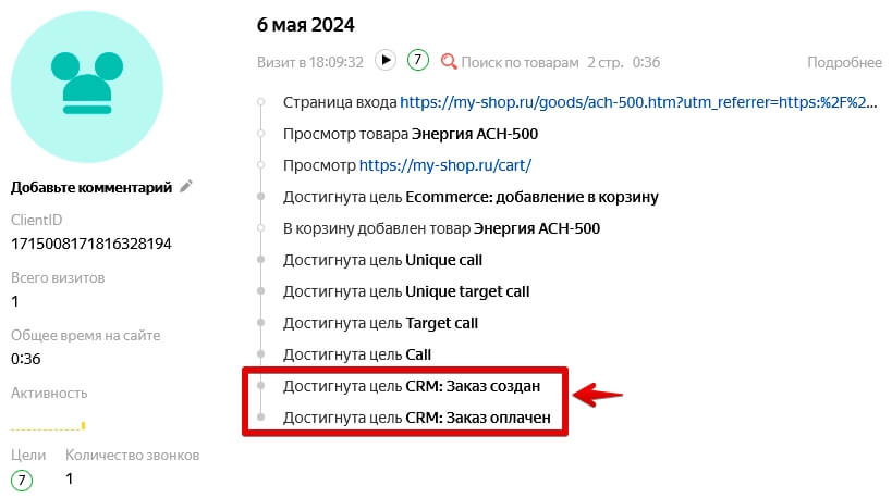 После завершения обработки данных заказов, в метрике автоматически появятся новые цели:
